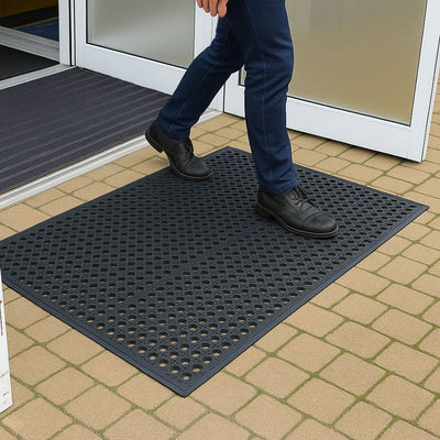 The design of these industrial mats includes features for optimal water, liquid, and debris drainage. The strategically placed drainage holes and channels facilitate quick and efficient removal of spills and waste, keeping the workspace clean and reducing slip hazards.